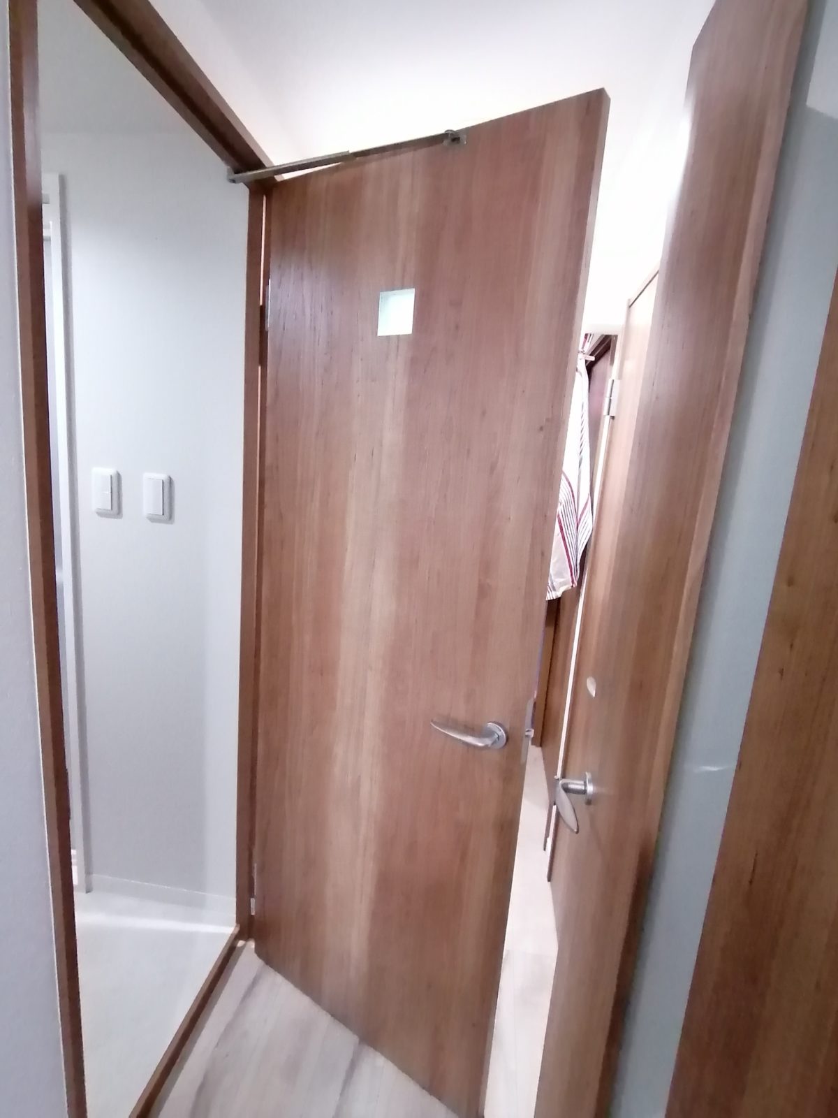開閉時に廊下をふさぐドア、中折れ式のドアに変更できないか?