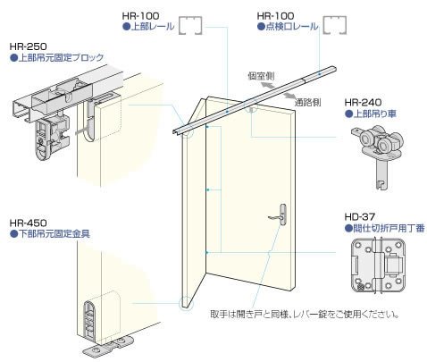 そんな時にオススメなのが、中折れドアです。上記画像の専用金物を使ってドアが折れて閉まることによって、廊下のスペースを確保できます。